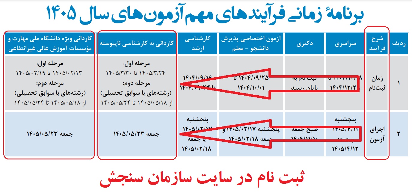 اگر هنوز در سایت سازمان سنجش ثبت نکرده اید، طبق جدول زمانی زیر، در مقطع تحصیلی مربوطه ثبت نام کنید