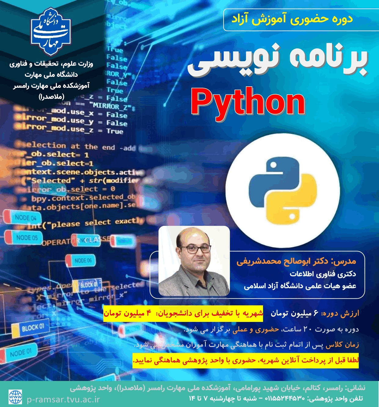 شهریه (فقط برای دانشجویان دانشگاه ملی مهارت): 1 میلیون تومان