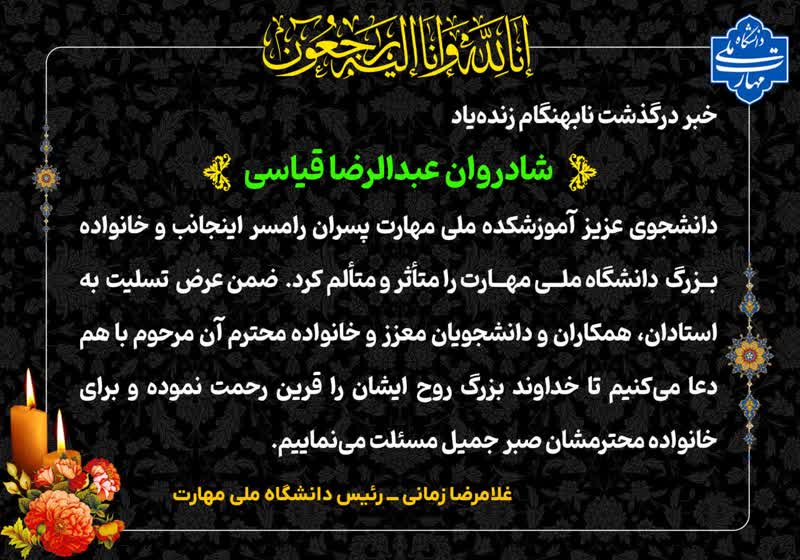 تسلیت درگذشت آقای عبدالرضا قیاسی؛ دانشجوی دانشگاه ملی مهارت