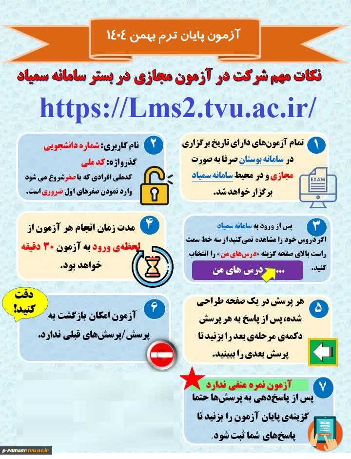 5- در طی مدت زمان برگزاری آزمون در صورتیکه دانشجو به هر دلیلی، قبل از ثبت اتمام آزمون ، از سیستم خارج گردد، می‌تواند مجددا وارد سامانه شده و از بقیه تایم خود استفاده کند. (یعنی اگر امتحانی در ساعت 11 تا 12 برگزار می شود و تایم آن نیم ساعت است. اگر دانشجویی ساعت 11 وارد شد و ساعت 11:10 اینترنتش قطع شد. تا قبل از ساعت 12 می تواند دوباره وارد شود و از باقیمانده تایم امتحانش استفاده کند. مثلا ساعت 11:30 دوباره وارد شود و از 20 دقیقه باقیمانده تایمش استفاده کند.)