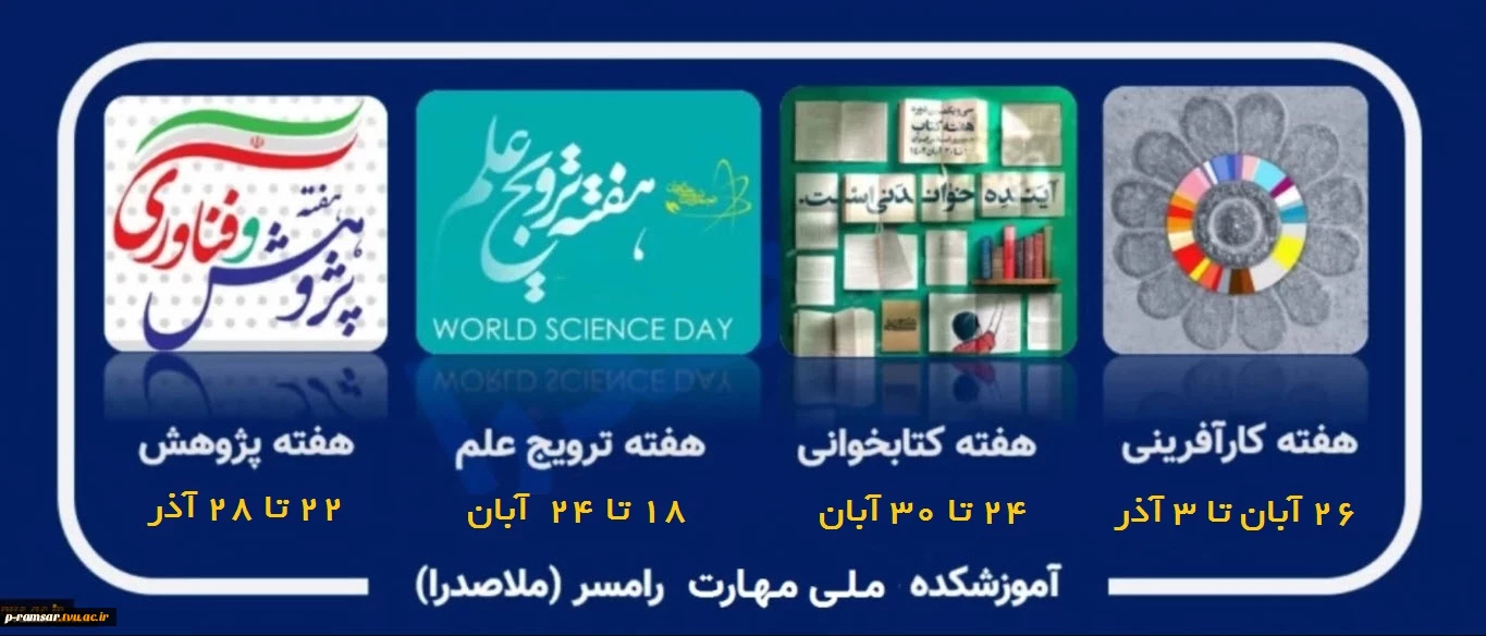 امتیاز دهید : برنامه های هفته جهانی کارآفرینی، هفته ملی کتاب و هفته ملی پژوهش 2 یکشنبه 18 آبان 1404 ساعت 19:26
